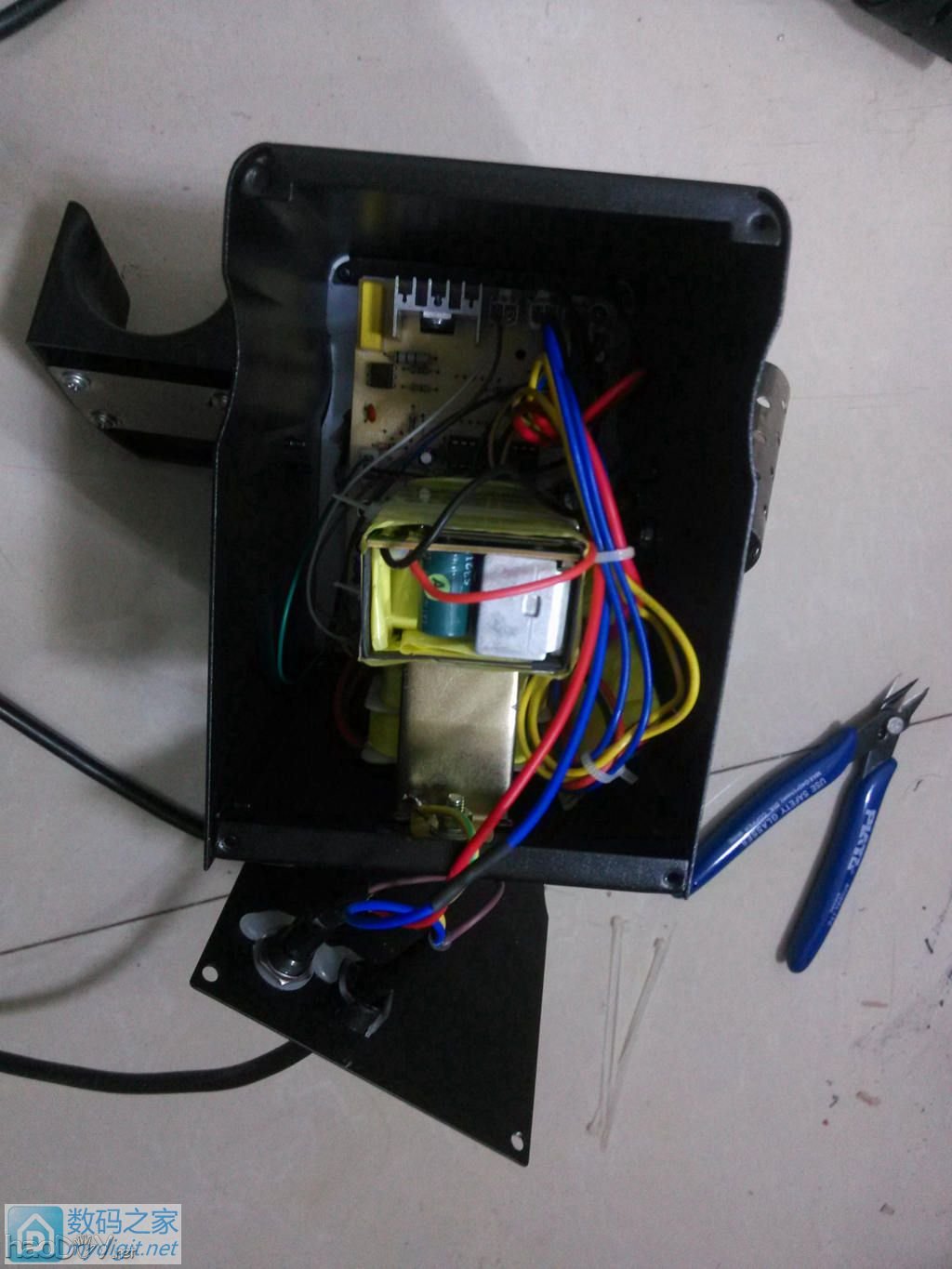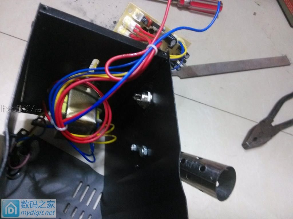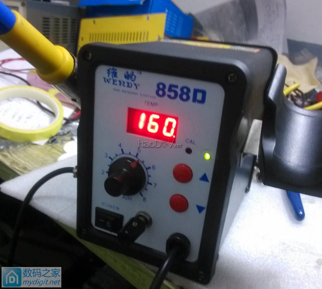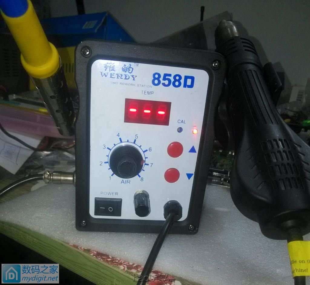 前两天手痒,鼓捣个NMOS白光控制板:http://bbs.mydigit.cn/read.php?tid=1979886 今天和女儿玩半天,趁她不缠着我,看到那板子主意来了, 正好热风枪不带焊台,何不将这玩意儿装进那风枪里,弄个一体的。。。 那就开始拆~ 正面。。。 ![]() ![]() 背面 ![]() 这是这家伙又来了,没办法,让她拆两下玩。。。 ![]() ![]() 开了,这可不是她拆的哈哈 ![]() ![]() ![]() ![]() 前控制板 ![]() ![]() ![]() 面板开孔。。。 白光电位器孔和指示灯孔 ![]() ![]() ![]() 控制板和共阴极红绿LED ![]() 热溶胶固定指示灯,安装电位器 ![]() 电源指示绿色串个电阻接线。。。 ![]() ![]() ![]() ![]() 绝缘做一下 ![]() 找出那电源。。。 ![]() 开壳 ![]() ![]() 本来想强迫症一把,不说白光必须24V么?呵呵 ![]() 可还得换这货,算了,20V平时用绰绰有余了 ![]() ![]() 接上线备着。。。 ![]() 最主要是那航空插端子,木那么大钻头。。。 ![]() 打算装在侧面,正面再装有点挤了。。。 ![]() 找到个这个,10MM的,扩孔。。。 ![]() 再稍加打磨正好能塞进去了。。。 ![]() 焊台拆下的 ![]() 装上去。。。 ![]()