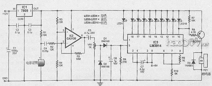 正常环境下,声音强度在30dB以下时会感想很动听,高于80dB就较量厌恶了,假如高出100dB就会影响到人的精力状态而激发一系列的负面效果,轻者分手留意力,精力压力增大,重者导致听力受损,乃至激发癫病。在家庭情形内的噪声强度约为47dB上下,但Hi-Fi音响体系以及高音量放音的电视机也许使声音强度进步到危及人类康健的水平。为检讨室内的噪声强度,这里先容一种检测和表现噪声强度的简朴电路,当它高出指定的应承强度时还会发作声音告诫。 电路由声音强度检测器和表现单位两部门构成。12V电源经IC1不变成9V输出供两部门电路行使。 声强检测器由话简、运放CA3130(IC2)组成,IC2接成高增益反相放大器事变模式,3脚牢靠在4.5V电位作为基准电压,2脚则接入话简输出信号,信号在6脚放大输出后经R5负反馈至2脚.因为放大器输入阻抗极高,因此很小的输入电流变革就能鼓励运放事变。 吸取器部门行使VR1节制输入音量巨细,噪声信号从VR1送入D2、D1、C6构成的电压泵电路,泵电路认真交换信号的整流并维持IC2的输作声压。表现单位由LM3914(IC3) 检测模仿电压并驱动10只LED作对数型模仿表现,通过LED的电流用IC3的内部电阻限定, 因此不必要外部电阻而使电路得以简化。10只LED的负极毗连IC3内部的10只较量器,当输入电压增进时,LED1-LED10的负极一一变低电位而发光, 每增进一只LED发光暗示噪声电平增进了3dB,因此当10只LED所有发光时,暗示此时噪声强度已高出LED1发光时的声强30dB。IC3 9脚毗连9V时可事变在点模式表现,即对应一种声音强度只有一只LED发光, 但两只LED间的发光有少量重叠,以确保不行能有所有LED处于熄灭状态的刹时。 当声音强度增进到IC3脚变低时,LED10发光,T1导通, 蜂鸣器发声,暗示此时室内噪声强度已到达比室内声强高30dB的水平。 安装时应将电容发话器装进管形容器中以增进迅速度,并用屏障线外接以镌汰滋扰。室内涵静态前提下的声音强度可用VR1调解, 细心调解VR1使第一只LED1恰恰发光,调好后将电路放在音响装备或电视机四面以监督其声音强度。