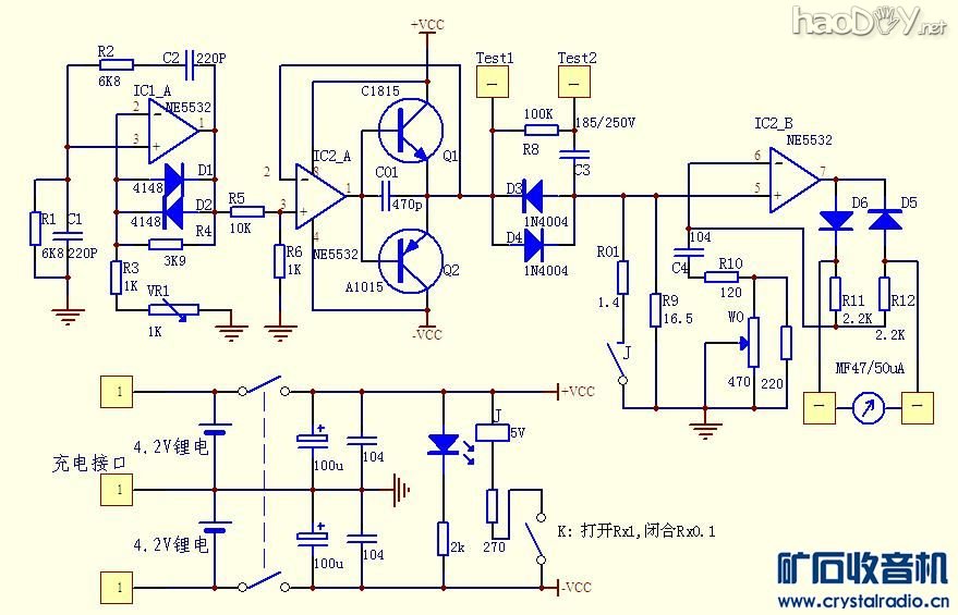 2.关于运放容易自激的问题我是这样处理的:一.测量表棒的引线不要太长,最好选用芯线粗一点的多股并线,尤其是Rx0.1档如果像万用表那样两根单独的表棒引线会形成杂散电感而影响读数以及自激。二.运放扩流后容易自激,为此增加C01-C04电容,C02和C03建议选用坦电容。在没有示波器的情况下可以通过以下两个方面来判断是否存在自激:a.接通电源后测试表棒开路时MF47表50uA档仍有好几个uA到几十uA的电流;b.Rx0.1档表棒短路时整机升至70-80mA甚至100mA以上。