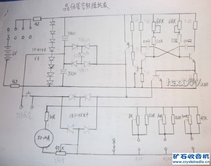 我1991年由于工作需要,按照香港飞利浦公司何国强先生使用的阻抗表,仿制了一台,效果较好,初学者不管做耳机,还是绕输出牛,测量效果都不错,结构比较简单,共使用5只三极管,4只NPN的,一只PNP的,16只二极管12只1N4148,4只2AK10(可用2AP9代替)一只50UA表头。 上外观图 外观就是这样 ![]() 调试顺序:先调整震荡频率为1000HZ,再调整方波正负宽度一致。 再分别调整乘10,乘100和乘1000的准确度,可以调零准确后,用准确的电阻与刻度调整一致 ![]()
