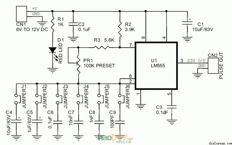 该信号发生器是一个基于NE555制作的。可用于实验用的信号源。电源电压为12V,最大工作电流为40mA,通过跳线设置可以输出1Hz-180KHz的频率范围。有电源指示灯。电路原理图如下图。