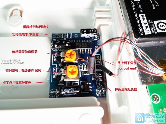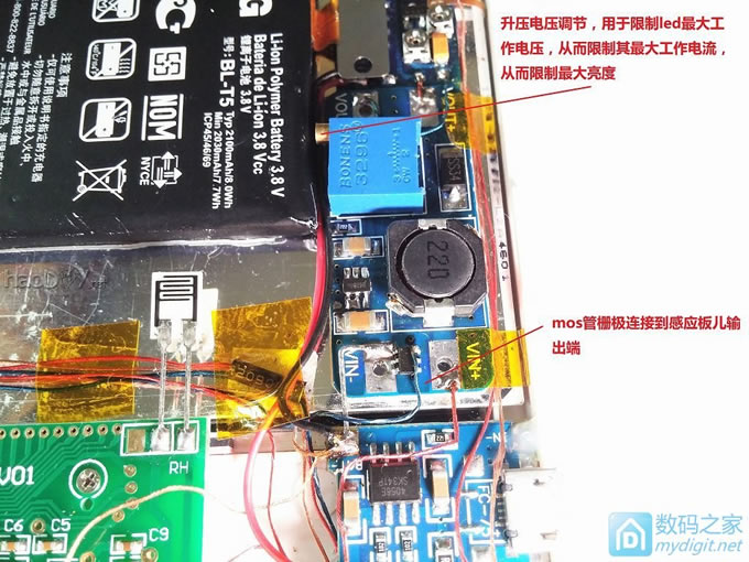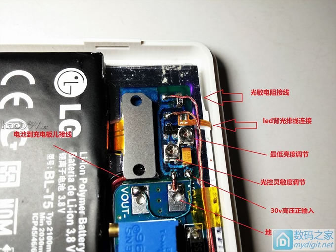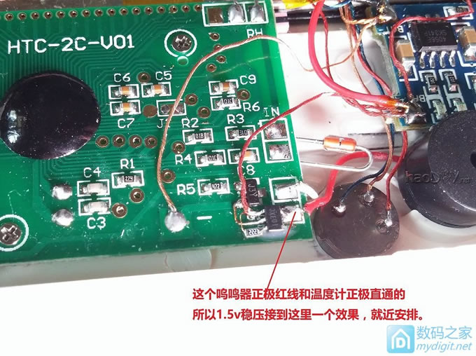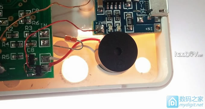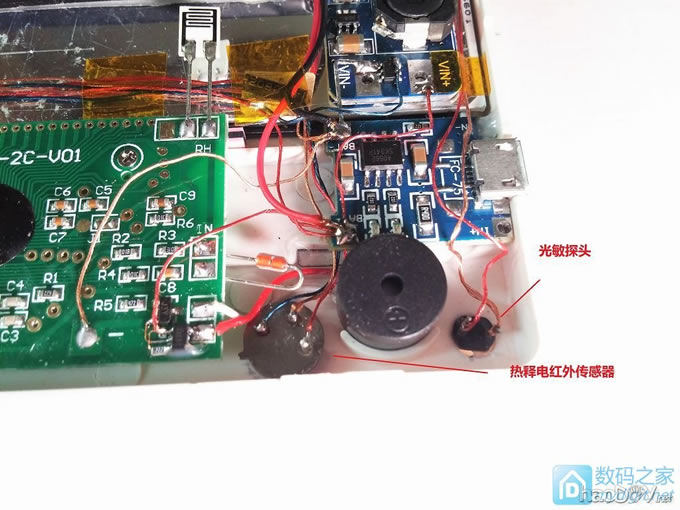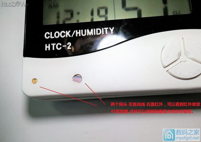 去年双11还是双12的在淘宝用优惠卷撸了一个数字温湿度计 模样精度什么的还算凑活,就是屏幕可视角度很差又没有背光功能,白天或晚上看清数字很费劲,夜间想看个时间用手电照着看着都费劲,面板反光,于是想给它添加led背光功能,改善可视效果,但是对于这种低功耗的东西添加背光功能耗电量实在是伤不起,于是萌生了加入“智能”背光功能,暂且这么叫吧,其实也算不上智能只是实现按需点亮背光,节约电力的目的,想了很多方案,红外光探测和摄像头探测。 以上以上两种 第一种只能实现感应移动物体点亮背光,不能分辨人体或物体效果不好,摄像头探测需要单片机套件和摄像头体积和功耗也不行还必须正对着温度计,于是想到热释电红外传感器和微波传感器,微波传感器功耗较大能勉强用但也不能分辨人或物,最后的热释电生物传感器功耗极低几十ua 覆盖面广,能分辨移动物体或人,于是最终选择红外传感加光控背光方案(光控背光类似于手机背光灯,可以根据环境亮度自动调节背光亮度,实现能耗和可视效果的均衡)下面开始 预计5层楼 下面外观 这张图是商家宣传图 实际显示效果并没有这么好 ![]() 背面 外面还有一个温度探头 用于室外温度的测量 ![]() 有个支架可以立在桌面 ![]() 拆开看看 内部很简单 块小板子 下面那两个弹片按键是复位和温度单位切换 ![]() 左面的白线是外部温度探头引线 中间的臭油块 白色陶瓷是湿度传感器 玻璃封装的是室内温度探头 ![]() 离近看看 贴片三级管是 呜鸣器驱动 ![]() 呜鸣器和晶振 ![]() 液晶 导电压条 按键 ![]() 液晶 背面的反光纸不透光要加背光必须揭掉 ![]() 揭下来后 ![]() ![]() 揭下后底偏光上一层牢固的胶,平时处理这个很容易,无水乙醇擦就可以了,这回这个费了劲了,任凭你擦还是泡纹丝不动 胶太厚了,最后无奈羊毛轮加乙醇磨 20分钟才完全去除 ,效果是这样的。 ![]() 然后找了一台旧手机4.7寸的背光模组,宽度正好,有点长 很薄 ![]() 需要剪掉一些 里面包含底反光膜 漫反板 增亮膜 均光膜 ![]() 裁好后 左面的排线是led供电 里面10颗led串联 这个是麻烦事,最少30v左右的高压才能驱动 找了一台旧手机 一个六脚的专用 驱动芯片 通过测量分析电路原理已经画出来了 但是只能驱动19v以下 串联背光模组,超过就保护,并且芯片内部决定不可改变,这块屏的板子是好的,我不想破环 只好另 寻他路。 ![]() 楼下继续。。。图片较多请耐心等待