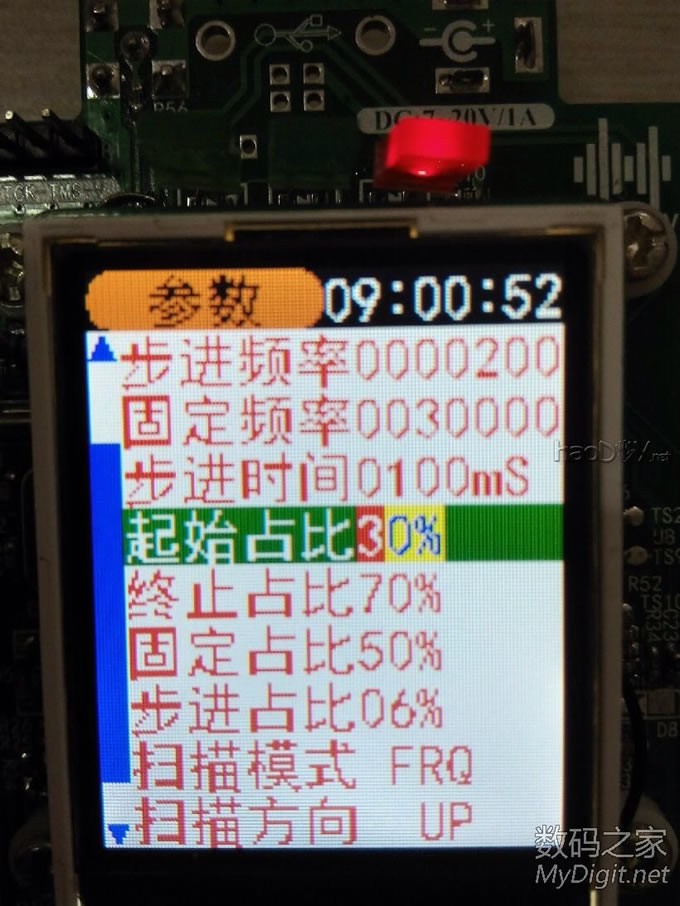 清理越积越多电子垃圾时,发现了两块TFT彩屏,SPI接口的,比较小,1.77寸160x120分辨率,是在tb买的,20RMB,一直积灰怪可惜的,打算做点什么,开始准备做个迷你示波器,不过显然这个TFT刷屏速度可用龟速形容,放弃;做个GPS万年历?大材小用,做个数字功放?不符合功放领域的一直追求的简洁要求;最后想来想去,在手持气象站和手持信号源之间摇摆不定,不过前者需要买微型风速风向大气压传感器和国人最看重的PM2.5/10传感器,价格贵一方面主要是结构我不好安装,所以,选择了后者做一个简易信号源.部分资料在4楼提供,欢迎下载. 先上效果图: 输出正弦波2.5MHz: ![]() ![]() 输出方波10KHz,60%占空比: ![]() ![]() 因为是业余制作,又是简单玩玩,所以功能要求比较低:只输出正弦波和方波,但是通过修改程序也可输出三角波,并且增加硬件可以生成锯齿波. 为保持不失真度,参数需求如下: 1.正弦波频率范围:100Hz~7MHz 2.正弦波电平偏移范围:0~2000mV 3.正弦波峰峰值范围:0~2500mV 4.方波频率范围:100Hz~4MHz 5.方波占空比范围:30%~80% 方案采用单片机+DDS+信号调理组成: 单片机采用我比较熟悉的STM32系列,依照本功能需求,选了性价比很高的STM32F103C8T6,价格在7~9元之间; DDS采用10脚SSOP贴片的AD9833,最大正弦波频率输出12.5MHz; 采用高速比较器将正弦波变为方波,单片机通过调节比较器基准调节方波的占空比; 本来是准备使用峰值检测电路控制增益的,但这部分效果不好,所以没有使用AGC功能,直接开环控制峰峰值,导致正弦波在大于7MHz以后幅值明显减少,所以我才将频率最大定在7M; 采用继电器切换正弦波和方波,为降低继电器功耗,采用了磁保持继电器. 并使用了单键开关机电路,这里有许多借鉴的地方,望同学们多多使用,哈哈 再说说这个简易信号源的功能: (1).点频功能:即手动设置单个频率点 (2).扫频:通过设置参数,如起始频率,终止频率,步进频率,步进时间,工作模式,扫描对象(频率还是占空比),扫频方向,循环模式等等,输出一段所希望的扫频信号. (3).参数调出与保存,最多6组点频/扫频参数调入与存贮. (4).RTC (5).系统参数设置,包括自动关机设置,背光亮度设置,时间设置,DDS输出设置和晶振开关设置等等,并且支持中文和英文界面切换. 这是硬件-原理图截图:[我用的Altium Designer 09] ![]() ![]() 这是硬件-PCB 3D预览: ![]() ![]() 这是硬件-PCB TOP层截图: ![]() 这是硬件-PCB BOTTOM层截图: ![]() 这是打样的板子,在JLC做的,太便宜了 ![]() ![]() 这是焊好+调试好的板子: ![]() ![]() 用SW设计外壳,[根据买回来的现成外壳画的]: ![]() 楼下继续... 将SW的外壳导入AD9里: ![]() ![]() 先用微软的visio设计我的界面需求,VISIO功能很强大,非常简单,建议大家多使用: ![]() ![]() ![]() ![]() ![]()