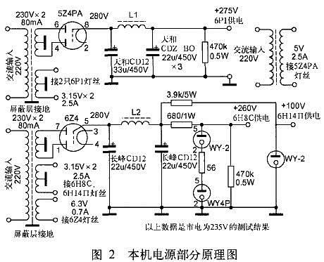 图2是本机电源部分的原理图。电源电路采用传统电子管整流CLC滤波加充气管稳压电路。高压供电分两路:输入级与电压放大级共用一路,输出级一路,左右声道共用。两只高压变压器均使用同一型号的6灯电子管收音机的拆机品,额定功率为50W。滤波电感L1与L2均使用同一型号的上海无线电二十七厂的额定功率为45W的电子管收音机电源变压器一次侧代替。