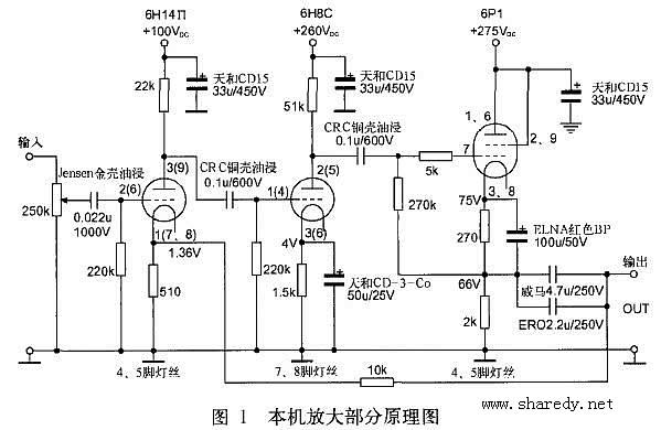 图1是本机放大部分的原理图。输入级兼电压放大由OTK生产的6H14п担任,为共阴极放大。6H14п产于1962年,采用玻壳小9脚双三极管封装,属旁热式中低μ低内阻电压放大管,参数见附表。本级供电电压为100VDC,阳极电阻取22kΩ,额定功率1W。阴极电阻取510Ω,额定功率0.5W。栅极电阻取220kΩ,额定功率0.5W。本级静态电流为2.6mA,栅负压为一1.36V,开环电压放大倍数为21倍。本级有电流负反馈与越级电压负反馈双重负反馈。