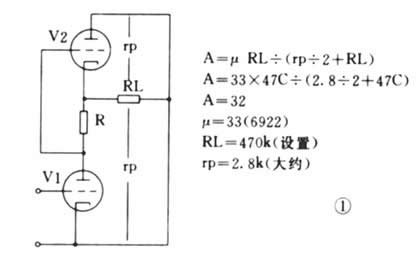 本前级电路基本设计原于1930年,(Shunt Regulated Push-Pull)分路调节推挽线路。当然还有其它译名,但笔者认为这译名最恰当传神,因这译名跟电路的工作状况相似。这种电路以前多用于无线电频道RF放大(它的高频线性特别优良),现代则为后级放大器用作前级电压放大级,或直接用作前级放大器,电路的优点是输入阻抗高,输出阻抗低,过载界限高,电路相移少,线性理想,电路结构简单,符合作为理想前级的条件,它的各项性能优于一般两级共阴RC交连或末级作阴极跟随器的典型电路。这种共阴电路广泛应用于过去或现今名牌身上,像C.J.,Marantz,A.R..,Dynaco,Matisse等等。SRPP等效电路如图1,V1管为一共阴极(接地)级放大,其增益取决于屏极阻抗,V2管则充当V1管屏极有源活性负载(变动),V2管对V1管起了一种电流源(类似稳压)作用,因此电路产生一种内部自调功能(受信号大小影响),而V2等也是一个阴极跟随角色,即两管各有各自的工作,而两管又是同心协力,因此电路可输出很大而产生失真很微,整体电路有效增益A,差不多是V1管本身的放大系数μ 。电路是没有总体负反馈,只有管子自身局部反馈,所以没有产生振荡或不稳定的表现。因没使用负反馈,信号相移不存在,相位线性优良,瞬态表现与失真非常超卓。