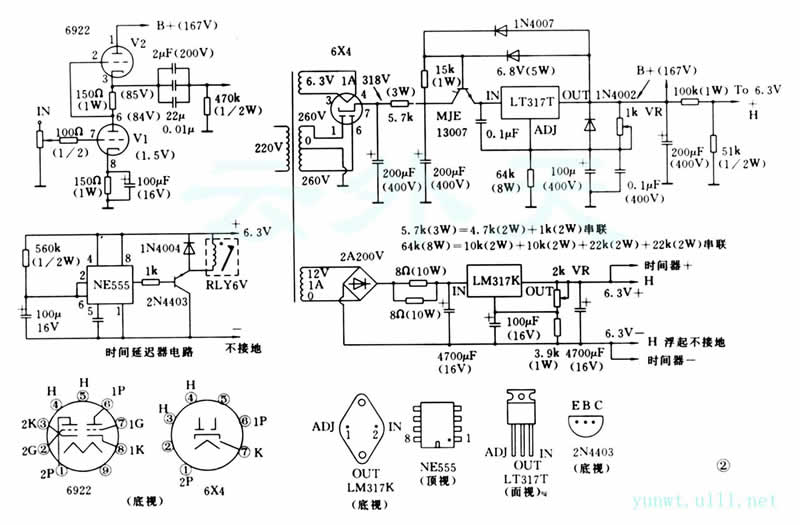 由于前级开机之后,管子与电压需要一段时间才稳定下来,为防止这段时间产生大的杂音,使扬声器受损害,因此使用一只运算IC NE555做成一个时间延迟器见图2,时间延迟器的时间大约一分钟,这样开关前后级也不用分先后次序。