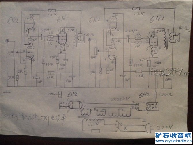 双声道6n2+6n1电子管小胆机功放 时间:2013-03-06 18:06 来源:www.crystalradio.cn 作者:PL81 点击:次 最近利用业余时间做了台小功放,全是手里现有的原件,每声道输出功率近1W,足够小房间听音用,先构思拼凑了个图,前置放大用的是6N2组成SRPP电路,此电路对直流来说是双三极管串联工作,对交流是并联推挽甲类工作,这种电路优点是失真小,高低频延伸好,速度快动态大和输出阻抗低。功放用6N1双三极并联。整流用手里闲置的6H2每声道单独整流。先看图 低板用铝合金门边料连钻带错尔成 2010-12-19 19:07:08 上传 下载附件 (31.38 KB) 六只小胆管 三头牛 顶部 (责任编辑:admin) 上一篇:仿制美国AMPEX 6516电子管胆机功率放大器 下一篇:最近组装的6P1电子管单端胆机功放 共2页: 上一页12下一页