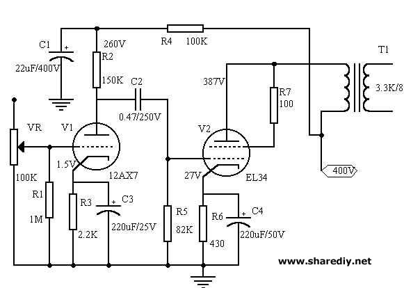 EL34单端扩音机 作者:安玉景 EL34电子管在音响发烧友中的知名度很高,在《高保真音响》2000年4月刊登的“最常见100种电子管排名”中,EL34高居榜首。国内外著名的电子管机生产厂家,有不少用EL34制作的电子管机名品。但是从功率输出级的电路形式来看,几乎都毫无例外的是推挽放大,原因是EL34的最大屏耗仅为25瓦,当采用单管单端放大时,如果按五极管或者超线性接法,最大不失真输出功率不超过12瓦,若是接成三极管,则只有6瓦左右。而采用推挽放大电路,就可以轻易的将输出功率做到三四十瓦,可见,在输出功率方面,推挽比单端大得多,但就音质和音色而言,单端机优于推挽机。笔者制作过的单端电子管机不少,有300B、2A3、EL34、FU15、FU50、FD422、FU7、6P3P、6N18P、6C33C等,也有好多发烧好友光临寒舍进行对比试听过,若要从音质价格比衡量,那么EL34无疑是最超值的,因为EL34的价格较低,差不多是300B的1/10,况且,此管不仅国内就有曙光、桂光、北京几种牌子,国外俄罗斯、捷克等国也在生产,选择余地很大。本文介绍的这台EL34单端功放,采用三极管接法,最大不失真输出功率有6瓦,介于2A3和300B的输出功率之间,用来推动雨后初晴LS 3/5A和用黑花岗岩制作的MOREL MW166+MDT32自摩箱,音色通透柔和,而且电路简单易制。 一、电路原理和特点整个电路使用两级放大,特点是不用负反馈。推动级采用半只12AX7,输出级采用一只EL34。将EL34接成三极管以后,内阻有700K欧之多,大约与300B与2A3相当,最佳负载范围在2-4千欧,负载阻抗大点则失真小,但输出也小,负载阻抗小则相反。本电路选用3.3千欧,使输出与失真两者兼顾,若从其输出特性曲线来看,EL34在三极管接法时虽然比五极管接法内阻小得多,线性也好得多,但线性仍然比不上直热管2A3和300B。如果不使用局部或者大环负反馈,其失真还是比较大的,但这种失真主要是偶次谐波失真,如果在不用负反馈的条件下减小这种失真呢?办法还是有的,这可以通过合理的选择推动管以及它的静态工作点、负载电阻来解决。本机采用高放大系数的著名电子管12AX7来作EL34的推动管,推动级和输出级的电路形式均为共阴极放大,这种放大电路的输入信号与输出信号相位相反,这样当推动管的电流增加时,输出管的电流减小;推动管的电流减小时,输出管的电流增加,因为三极管在小电流时的输出特性曲线是弯曲的,不是直线,所以会产生非线性失真,但是,这两个管子所产生的失真方向是相反的,所以可以互相抵消一部分。假如推动级一点失真没有,则输出级产生的失真全部出现在负载扬声器上。但是如果适当选择推动管的工作点和交流负载电阻,故意使这一级产生的失真程度与输出级大致相当,就可以利用他的抵消作用使负载扬声器上的失真大大减小。本机中推动级12AX7的静态电流设计为0.7mA左右,使之位于输出特性曲线的弯曲部分,这一级的交流负载电阻是其屏极电阻(150千欧)和下一级栅极电阻(82千欧)的并联值,约为53千欧,在这种情况下,用示波器观察输出波形可以看到,当因为输入信号过大而产生过载失真时,正弦波的顶部是圆滑的变钝,这就意味着本功放在过载时非线性失真的增加速度是比较缓慢的,使本功放虽然输出功率不大,但是听感甚佳。本机输出电路和推动级一样使用自给偏压,这种电路比较简单,并且对输出管有一定的保护作用,EL34的静态工作点如下:屏阴极电压:Ua=360V 屏极电流Ia=63mA 栅极负栅压Ug=-27V 静态屏耗Pa=360×0.063=22.6W,小于其最大屏耗25W,较安全电源电路采用电子管5Z4P作全波整流,滤波电路采用CLC式π型滤波,这种滤波方式的残留纹波形式近似于正弦波,不影响听感。整流管采用旁热式的5Z4PA,而不采用直热式的5Z3P或5Z2P,因为直热管的灯丝热的特别快,不等EL34的灯丝热起来,直流高压就加到屏极和阴极之间了,这样长久下去会影响功率管的使用寿命。即使是采用了5Z4P的情况下,其阴极还是比EL34热的快,但毕竟时间差大大缩短了。请不要小看这一点,有许多采用晶体管整流的电子管机器,使用不到一年,电子管就严重老化,阴极发射能力大大降低,而一些使用电子管整流的收音机,用上十几年仍不减当年。二、元器件选择与制作前级放大管可以使用12AX7、6N4等双三极管,也可以每声道使用一只6G2或6AT6,只是早年在电子管收音机中使用的二极三极复合管,其中三极管部分的特性与半只12AX7相同。输出管也叫6CA7,前苏联的老型号叫6N27C。现在有很多牌子的可以选择,它们的基本结构相同,音色略有差别。笔者使用的是我国曙光,整流管采用国产5Z4PA,最大整流电流为140mA。输出变压器的素质决定了整机性能的优劣,所以是成功的关键所在。由于本机没有使用负反馈,故输出变压器的频响几乎就决定了本机的频响,那么,怎么简单的判断一个变压器的频响究竟如何呢?我们知道,决定变压器频响的主要因数是他的初级电感和漏感,对于一个好的输出变压器,二者之间的比值应该在1000以上,笔者用DL6423数字电容电感表测量过欧博的300B输出变压器,它的初级电感约为11H,漏感仅10.6mH。具体测量方法如下:先用20H档测初级线圈的电感,记下它的数值,然后用一根短的导线讲次级短路,然后在测量初级电感,这个数值就是漏感,两者之比越大越好,一般大约600的时候就基本满足要求了。除此之外,还要注意变压器铁芯的气隙和初级线圈的直流电阻,气隙太小时虽然电感量会大一点,但容易产生