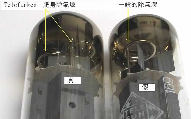 德律風根的細膽,佔絕大多數都有兩個重要的分辨真偽特徵,第一是德律風根的獨有肥身除氣環圖(7a),這除氣環在膽內近頂部近水銀(除氣劑)之處,而奇怪的是德律風根維持了三份之一個世紀造膽歷期,是從沒有使用D型除氣環的,德律風根廠無論造大膽或是細膽都是同一特色的肥身環,是與其他牌子不同的。第二要留意的是這<>方形玻璃Mark是凸出的,而在<>中央是有凸出的數目字。若見凹下的<>Mark或數字,則須提高警惕。