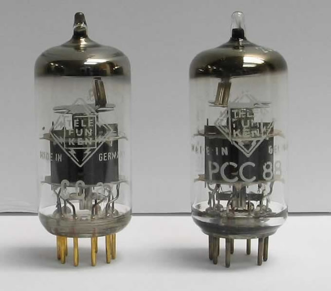 圖(7)左是德律風根的CCa,是德律風根E88CC系列中的最貴型號,若與同期的E88CC在聲音方面的比較,CCa較有音樂感和稍厚潤的中音,但收歛了少許激昂的動力。整體上來說,德律風根是有很重的自我個性,就是極強調和傾前的中音,在配搭器材上使用得合宜的話,也算是好的較聲工具,這也是優點。另方面講因它較強調中音,可能因此減弱了聽者對音樂高低頻寬度的比例感覺;還有的是,即使我們不太要求頻率闊度的話,Brimar和Siemens也是相當著重中音的表現,就單以中音段來比較,德律風根對輕、重、強、弱音的對比上出了混淆和含糊,對聽音樂所要求的「抑揚頓挫」更顯出不足,若在整套器材上使用得過多德律風根時,更可能出現悶厭之感;但偶兩用一至兩支來作適量的校聲亦無不可。圖右是德律風根PCC88,特性和ECC88大致上是相同;不同之處PCC88是7V燈絲;而ECC88是6.3燈絲,基本上PCC88是可直代ECC88,雖然燈絲電壓供應有少許不足,但並不直接影響音質的表現,這德律風根PCC88是普通腳的膽,雖未被列入貴價儀器級,又因它是Hi Fi的製造要求,所以頻應的闊度和音樂感都不會在CCa之下,它還比CCa更生動和活躍。德律風根迷又多了一個「掃貨」的目標了。