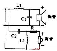 对于自制音箱来说,采用传统的功率分频器比较简单,见图 2 。从图中可以看出,传统的功率分频器只有 L1 、 C1 、 L2 、 C2 以及高音衰减电阻 R 等 5 个元器件就可以组成。 L1 、 C1 组成低通滤波器,通过它的作用,只保留音频信号中的低频部分去驱动低音扬声器单元。 L2 、 C2 组成高通滤波器,只保留音频信号中的高频部分去驱动高音单元。普通的二分频器还可以采用一只电感、一只电容的分频方式和比图 2 复杂的分频方式。这些不同的分频方式各有优缺点。但本文的出发点还是以最常见的图 2 为基础。